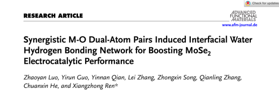 芒果体育化学与环境工程学院任祥忠教授团队在材料领域顶尖期刊《Advanced Functional Materials》(影响因子18.5,中科院JCR 1区,TOP期刊)发表了题为《Synergistic M-O Dual-Atom Pairs Induced Interfacial Water Hydrogen Bonding Network for Boosting MoSe2Electrocatalytic Performance》的研究论文。该团队助理教授罗兆艳和硕士研究生生郭逸润为论文共同第一作者,芒果体育任祥忠教授为该论文通讯作者,芒果体育为唯一作者单位和唯一通讯单位。