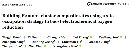 芒果体育化学与环境工程学院任祥忠教授团队在材料领域顶尖期刊《Carbon Energy》(影响因子19.5,中科院JCR 1区)发表了题为《Building Fe atom-cluster composite sites using a site occupation strategy to boost electrochemical oxygen reduction》的研究论文。该团队硕士研究生周廷仪为论文第一作者,芒果体育任祥忠教授和罗兆艳助理教授,中国科学院长春应化所邢巍教授为该论文共同通讯作者,芒果体育为第一作者单位和第一通讯单位。