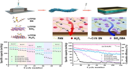 纳米纤维和聚合物电解质的制备合成示意图和丁二腈基固态锂电池的性能测试图