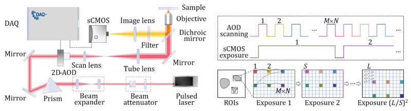 超分辨光学显微成像技术是突破光学衍射极限、实现纳米级生物结构观测的核心工具。然而,现有多焦点结构光照明显微技术(MSIM)受限于机械扫描或光调制器刷新速率,难以兼顾高分辨率与高速成像。本研究提出了一种基于声光偏转器(AOD)的寻址扫描多焦点结构光照明显微技术(AS-MSIM),利用声光器件实现无机械惯性的快速寻址扫描,结合图像探测器同步曝光策略,首次在多个离散区域内完成超分辨成像。该技术不仅能将MSIM超分辨成像速度提升4-30倍,还显著降低了光漂白与光毒性,为活细胞长时程动态观测提供了新方案。