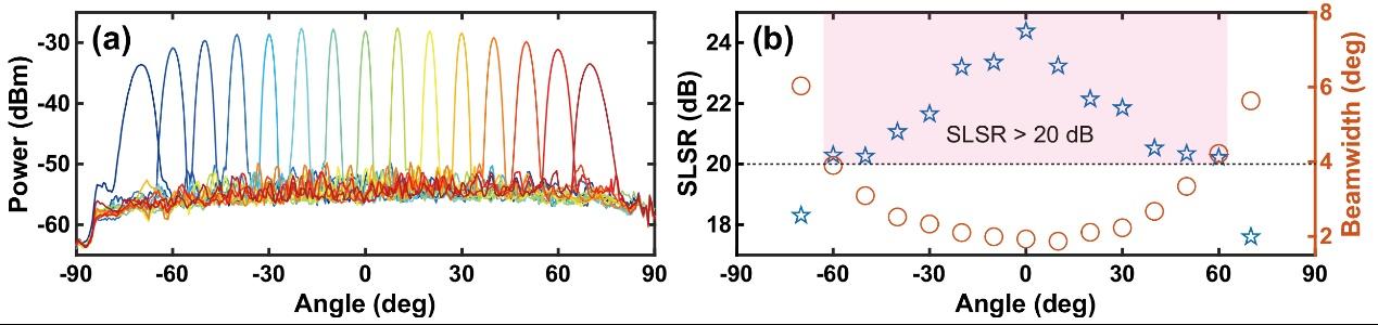 秦琦课题组及刘晓平课题组通过创新设计,首次在同一个光学相控阵上实现大视场、高旁瓣抑制比和复杂波束赋形。团队提出的新型硅基光学相控阵架构如图2所示。该架构采用半波天线以实现大范围扫描,发射天线由64根波导阵列组成,波导间距为半波长(775 nm),工作波长为1550 nm,通过波导端面直接向外辐射。半波天线通常受到串扰和加工误差影响,产生相位与幅度偏差;团队突破传统抑制串扰的设计思路,采用高消光比的分束网络和相移器预先校正相位与幅度偏差。该分束网络采用由两层马赫-曾德尔干涉结构组成的二分树结构,实现任意的光强分布,不仅可以实现相位与幅度偏差的预校正,并实现精确可调强度调制,使能复杂波束赋形能力。同时为了提高远场信噪比,该架构引入了多种抑制杂散光的策略,包括空气孔和偏振分束器等优化设计。实验表明,该硅基光学相控阵在120°视场范围内进行波束扫描时,旁瓣抑制比依然能够保持在20 dB以上(图3)。