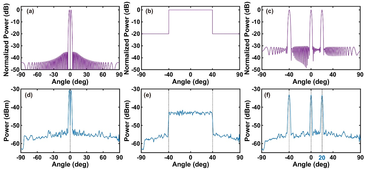 同时,因具有精确可重构强度调制能力,该光学相控阵还支持任意的波束赋形。团队首次在光学相控阵上实现了Bayliss差波、脉冲形方波和非对称三光束三种具有重要应用价值的复杂波束;通过实验获得了与目标波束高度吻合的结果(图4)。这些成果标志着光学相控阵同时实现了小发散角、高旁瓣抑制比及复杂波束赋形三方面能力的突破。类似于波束赋形在5G技术中的重要性,具有波束赋形能力的光学相控阵有望成为在激光雷达、空间光通信、自动驾驶等领域的关键基础技术。