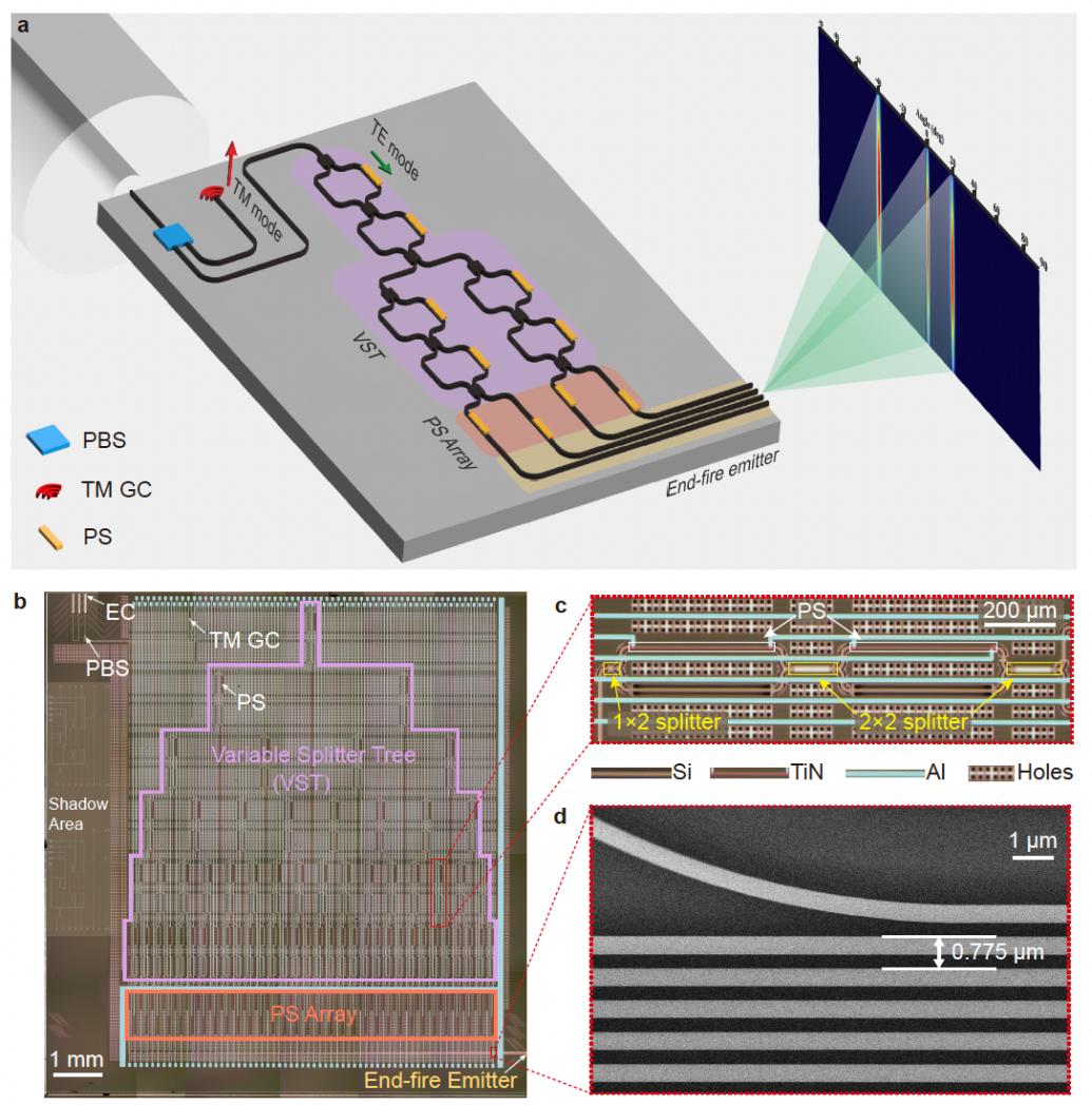 该研究提出一种新型硅基光学相控阵架构,首次在单个硅基光学相控阵中同时实现了大视场、高旁瓣抑制比和复杂波束赋形功能。