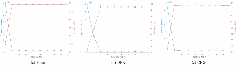 图2. ODSVM的收敛性与识别率变化情况。在不同的二分类、多分类任务中,ODSVM模型的目标函数值能快速单调下降且收敛,分类准确率呈迅速上升并逼近最高精度。