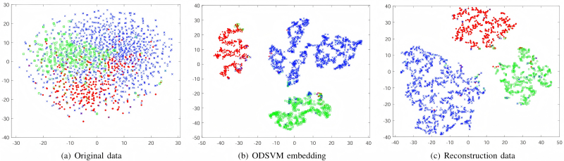 图1.可视化ODSVM学习到的特征,不同颜色表示不同类别的数据,可见其性能之优异。