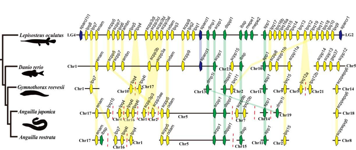鳗鲡目鱼类在进化过程中,体表无鳞或有极少且退化的鳞片。鳗鲡目和其它具有正常鳞片的硬骨鱼类之间,存在某些参与鳞片形成的基因差异。其中,SCPP基因家族编码一系列富含P/Q的分泌型钙结合磷蛋白,参与骨骼矿化以及牙齿和鳞片形成。研究结果表明,鳗鲡目鱼类的SCPP基因数目明显较少(图4),推测某些特定SCPP基因的缺失可能与鳗鲡目鱼类鳞片极度减少现象相关。总之,本研究为鳗鲡目鱼类染色体核型及体型进化的分子机制提供了新见解。