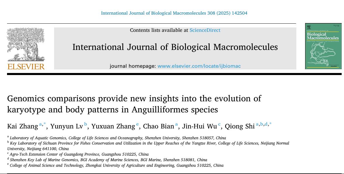 近日,芒果体育生命与海洋科学学院石琼特聘教授团队在生物学top期刊International Journal of Biological Macromolecules(影响因子7.7)上发表题为“Genomics comparisons provide new insights into the evolution of karyotype and body patterns in Anguilliformes species”的研究论文。