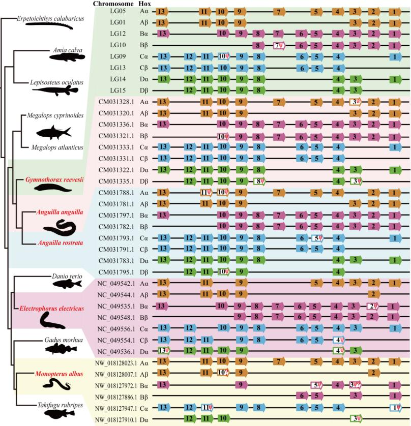 Hox和tbx两个基因家族与鱼类鳍条发育密切相关。分析发现,海水鳗(无胸鳍)基因组中某些Hox基因(如HoxB9β和HoxD13)发生丢失,并且特定tbx基因(tbx5)出现变异(图3),这些可能是鳗鲡目鱼类胸鳍退化的关键因素。
