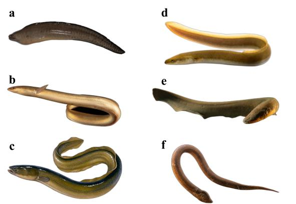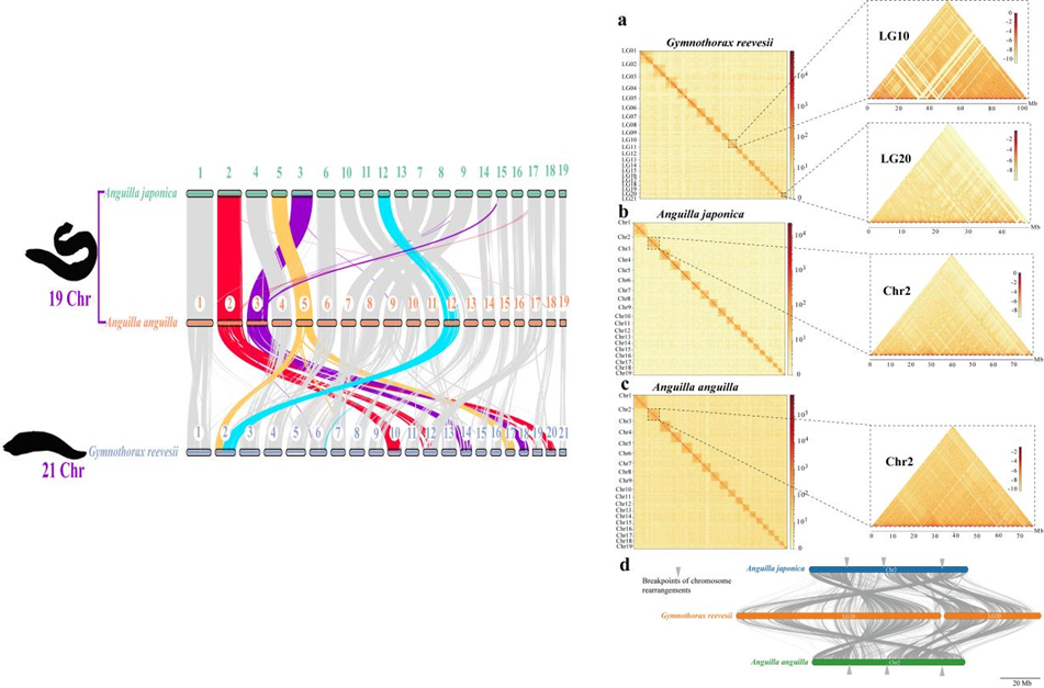 鳗鲡目鱼类在生态学和生物进化研究中具有重要地位。它们长相奇特,譬如体长条、圆筒形,无腹鳍,皮肤光滑且少鳞或无鳞,鳃孔狭窄,一些海水鳗甚至没有胸鳍(图1)。此外,鳗鲡目鱼类的染色体数目呈现多样性,通常海水鳗拥有21对染色体(Zhang K.et al.,Scientific Data, 2023, 10:501),而淡水鳗只有19对染色体(图3左)。因此,鳗鲡目为深入研究鱼类的体型及染色体核型进化提供了理想材料。但目前相关研究还极其缺乏。