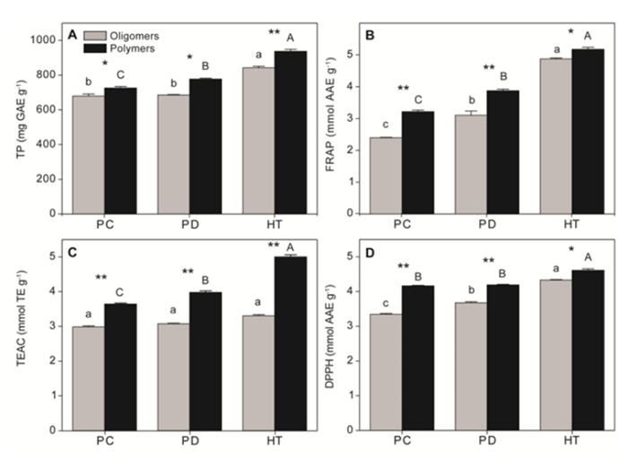 在抗氧化活性测试中,研究采用了Folin-Ciocalteu、FRAP、TEAC和DPPH四种方法,结果显示HT的抗氧化能力最强,其次是PD和PC,且聚合体的抗氧化活性普遍高于寡聚体(图2)。这主要归因于结构中对苯二酚和儿茶酚型羟基的数量和位置,HT因富含GA而具有更多的羟基,从而表现出更强的抗氧化活性(图1)。