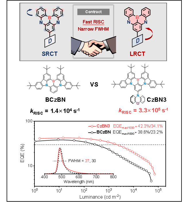 显示技术是信息传递与交互的重要桥梁,对数字经济的发展具有深远意义。作为新一代显示前沿技术,有机发光二极管(OLED)凭借卓越的色彩表现、超高对比度以及灵活多变的形态设计,引领着未来显示产业的发展方向。其中,高性能有机电致发光材料是实现高清OLED的核心。近年来,具有刚性稠环骨架和短程电荷转移(SRCT)特性的多重共振热活化延迟荧光(MR-TADF)材料兼具高效率及窄谱带发射,被视为下一代显示的理想候选。但该类材料仍面临合成困难、延迟荧光寿命长、效率衰减严重及器件寿命不足等瓶颈,亟需新的分子设计策略和器件优化方法。