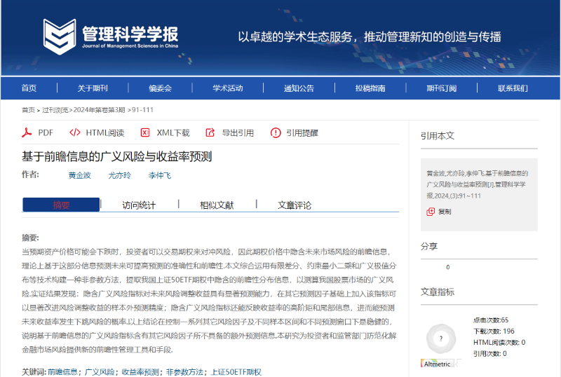 经济学院金融系教授黄金波等的论文“基于前瞻信息的广义风险与收益率预测”在《管理科学学报》2024年第3期正式发表。《管理科学学报》由国家自然科学基金委员会管理科学部与天津大学共同主办,是国家自然科学基金委管理科学部认定的A类重要期刊,入选中国科协“FMS管理科学高质量T1级中文期刊”,在管理科学领域享有极高的学术声誉。该文由芒果体育经济学院黄金波教授、对外经济贸易大学尤亦玲博士生和南方科技大学李仲飞讲席教授合作完成,芒果体育经济学院为第一完成单位。