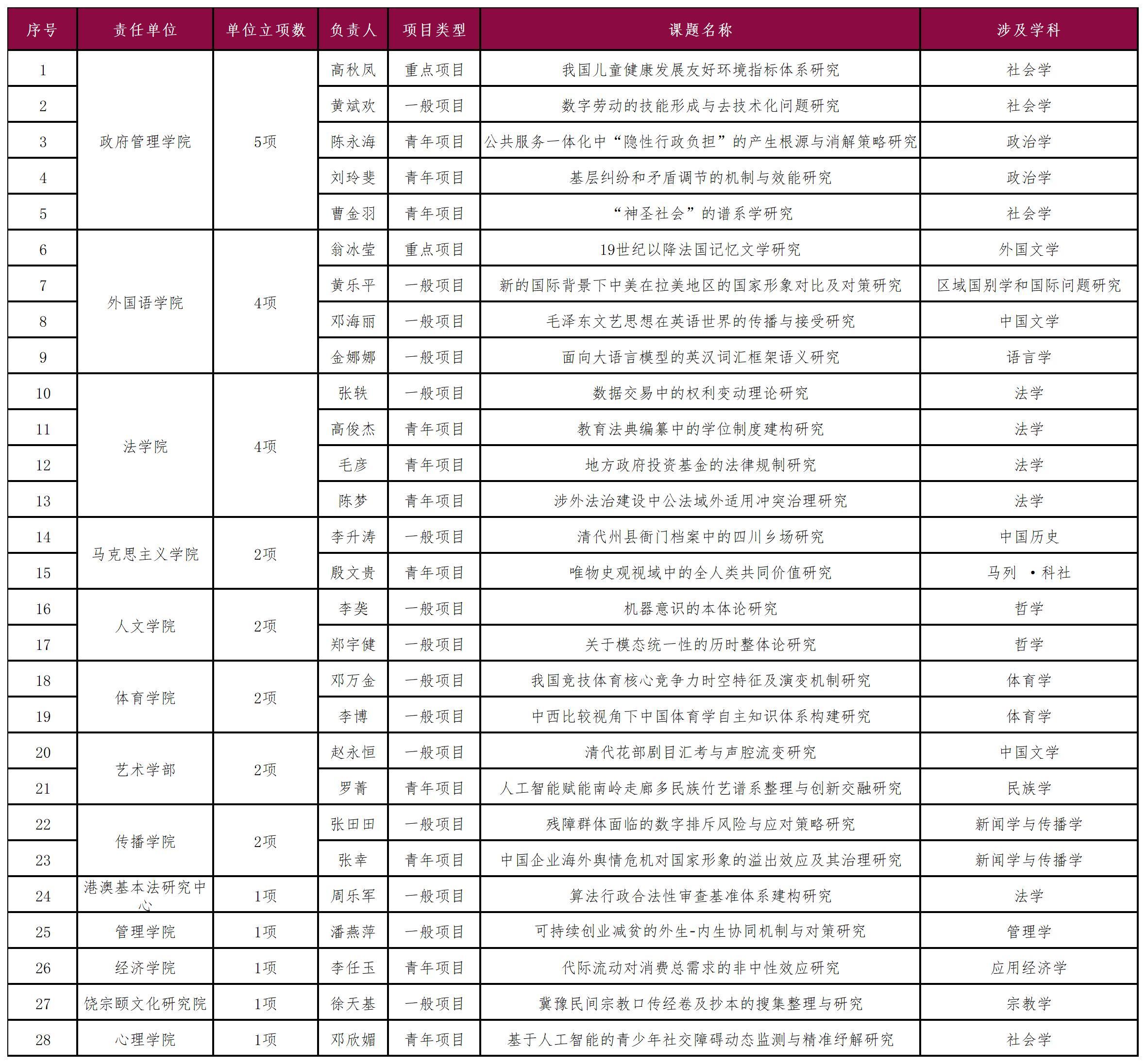 其中重点项目2项,一般项目15项,青年项目11项。截至目前,芒果体育已获得国家社科基金各类项目共计31项。